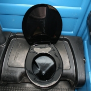 Caixa de dejetos com assento, porta papel higiênico, piso antiderrapante em polietileno, identificação (masculino/feminino), descarga na caixa de dejeto com acionamento manual, ponto de ventilação natural, mictório, teto translúcido, fechadura de metal com sinalizador (livre/ocupado).